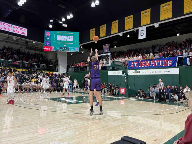 Riordan's JP Pihtovs shoots a 3-pointer during the Crusaders' 53-51 win over St. Ignatius on Tuesday night at the University of San Francisco. | Benjamin Rosenberg/Prep2Prep |